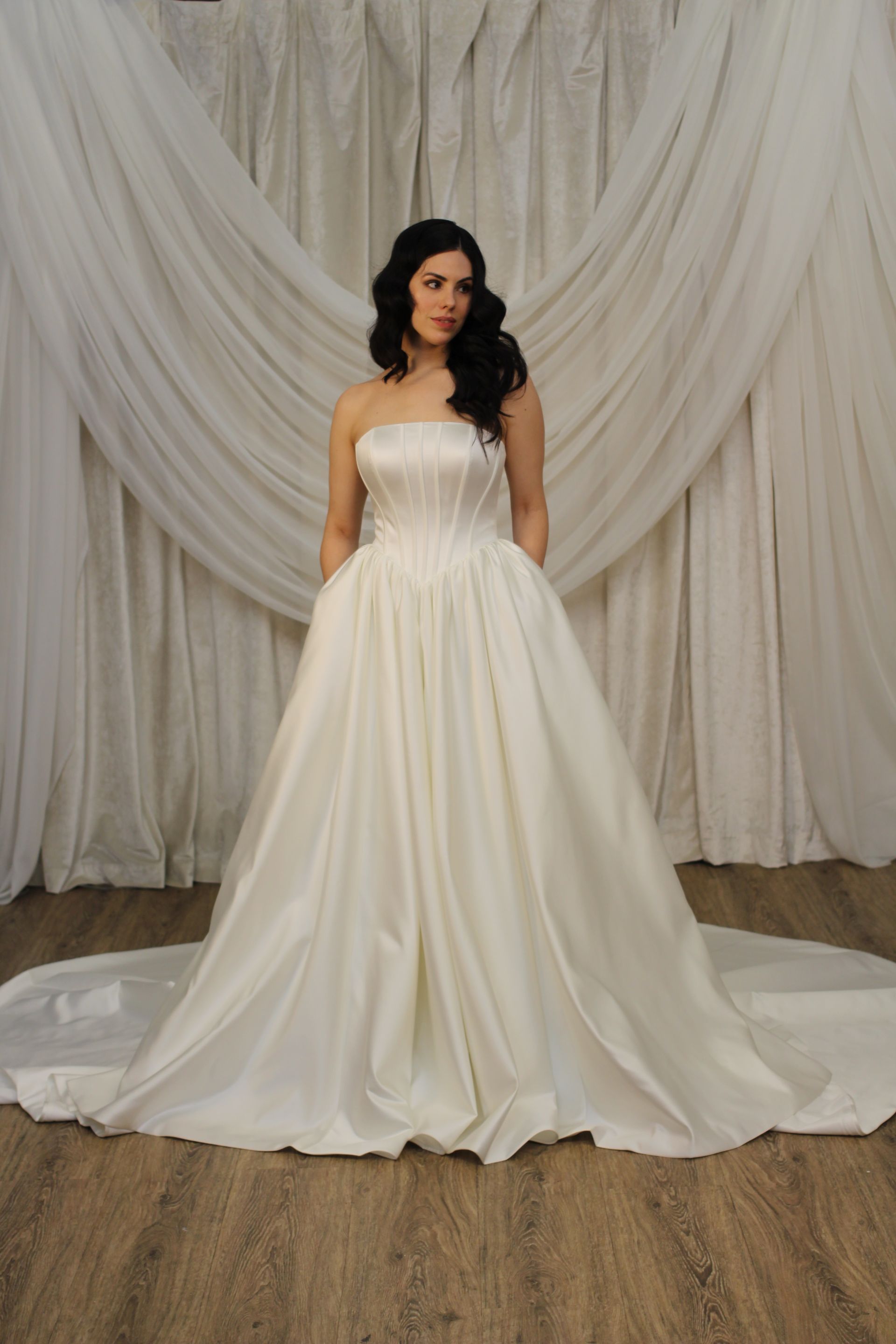 Our wedding dress collection ranges from approximately $1200-$15K, most between $2500-$7000. Sizing can be ordered from 00-32.